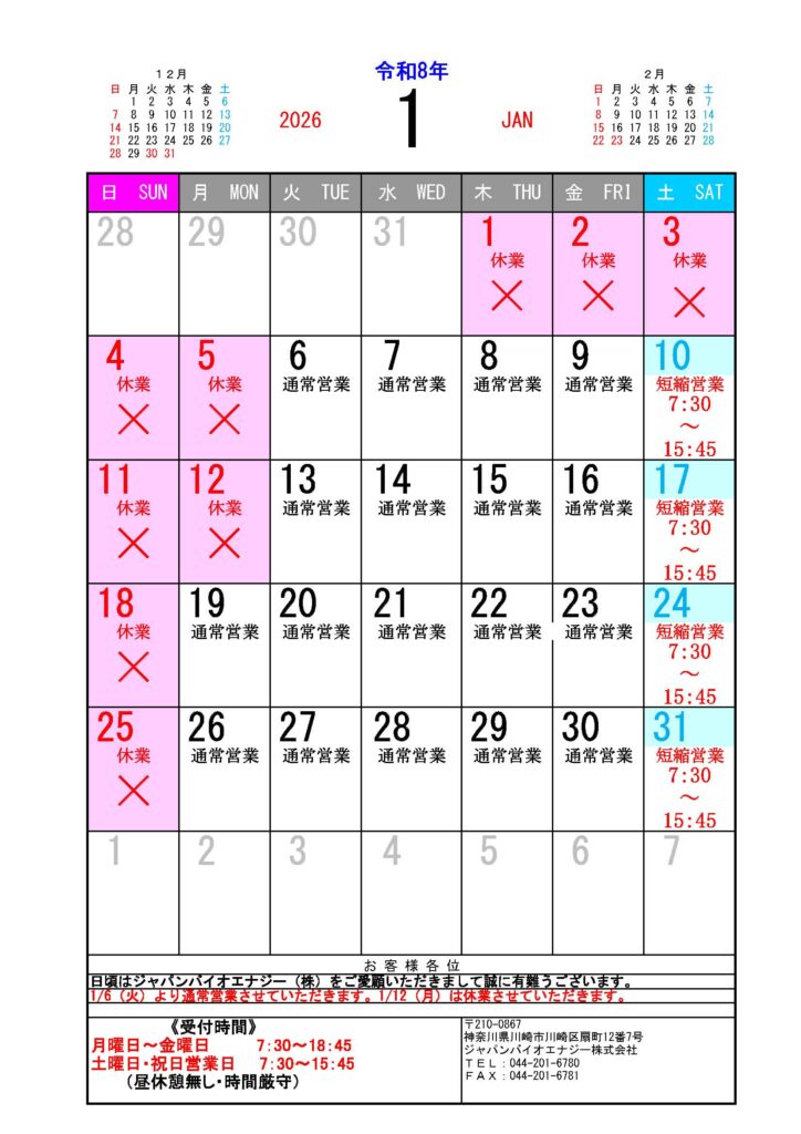 ニュース トップページ > ニュース・トピックス > 2026年1月度営業カレンダーのお知らせ 2026年1月度営業カレンダーのお知らせ 2025年11月18日ニュース 平素は格別のお引き立てを賜り、厚く御礼申し上げます。 弊社の2026年1月度営業カレンダーをご案内いたします。 →2026年1月カレンダーPDFデータ 一覧に戻る