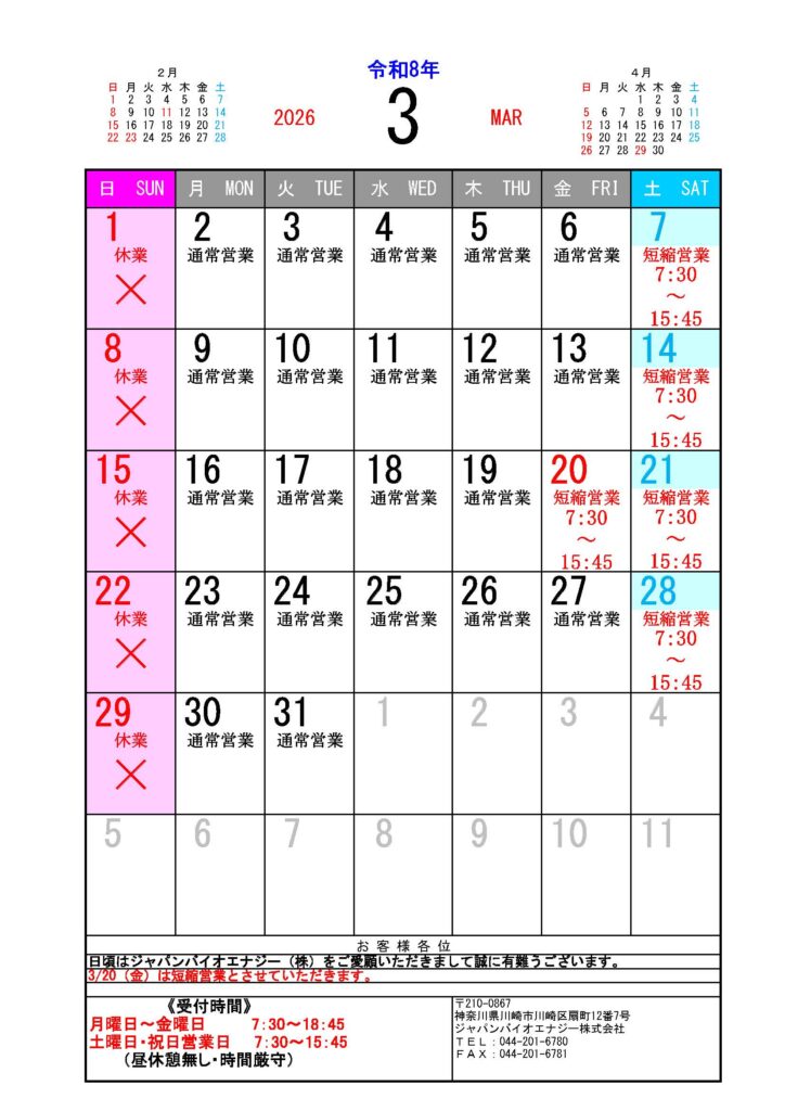 ニュース トップページ > ニュース・トピックス > 3月度営業カレンダーのお知らせ 3月度営業カレンダーのお知らせ 2026年02月26日ニュース 平素は格別のお引き立てを賜り、厚く御礼申し上げます。 弊社の3月度営業カレンダーをご案内いたします。 →3月カレンダーPDFデータ 一覧に戻る